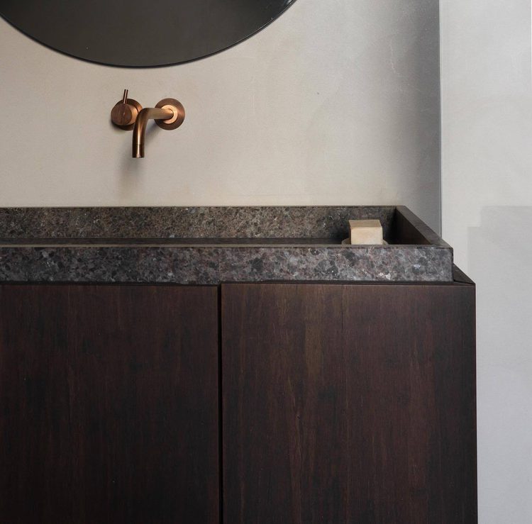 A perfect example of Ask og Eng’s material philosophy is the AE7 vanity unit — a design where the tactile warmth of bamboo meets the refined strength of Lundhs Antique®. The vanity’s bamboo cabinetry, treated with hard wax oil, is paired with a natural stone top that adds depth and visual contrast. To complete the space, the same stone is used on the bathroom floor in a different finish, creating a seamless and cohesive look.