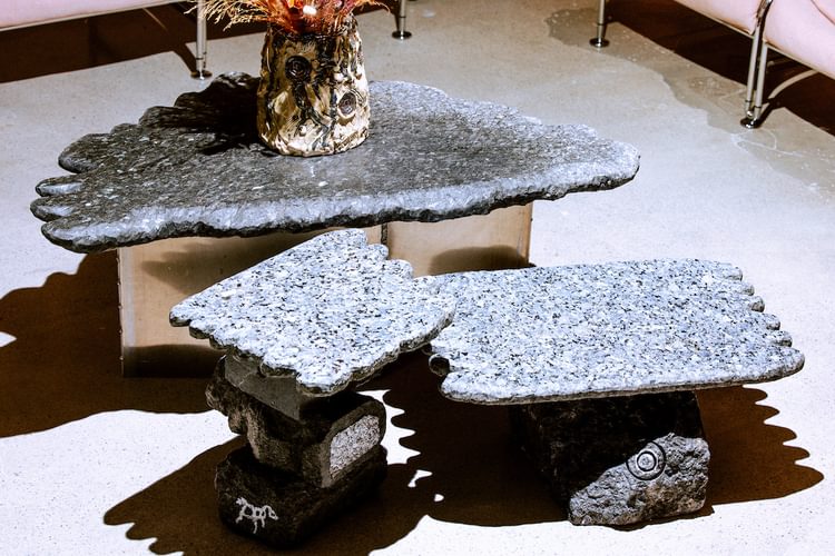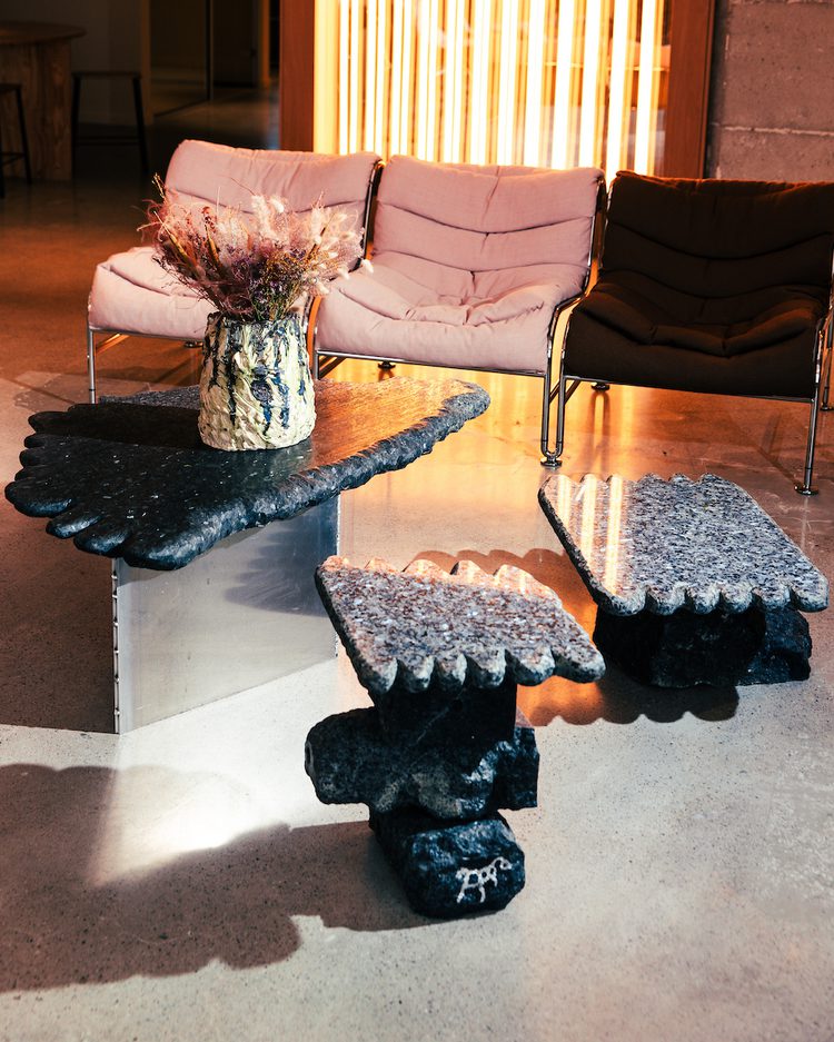 Combining natural stone with aluminum, the three tables showcase a refined combination of raw materials and industrial design—where sustainable resources have been transformed into functional art.