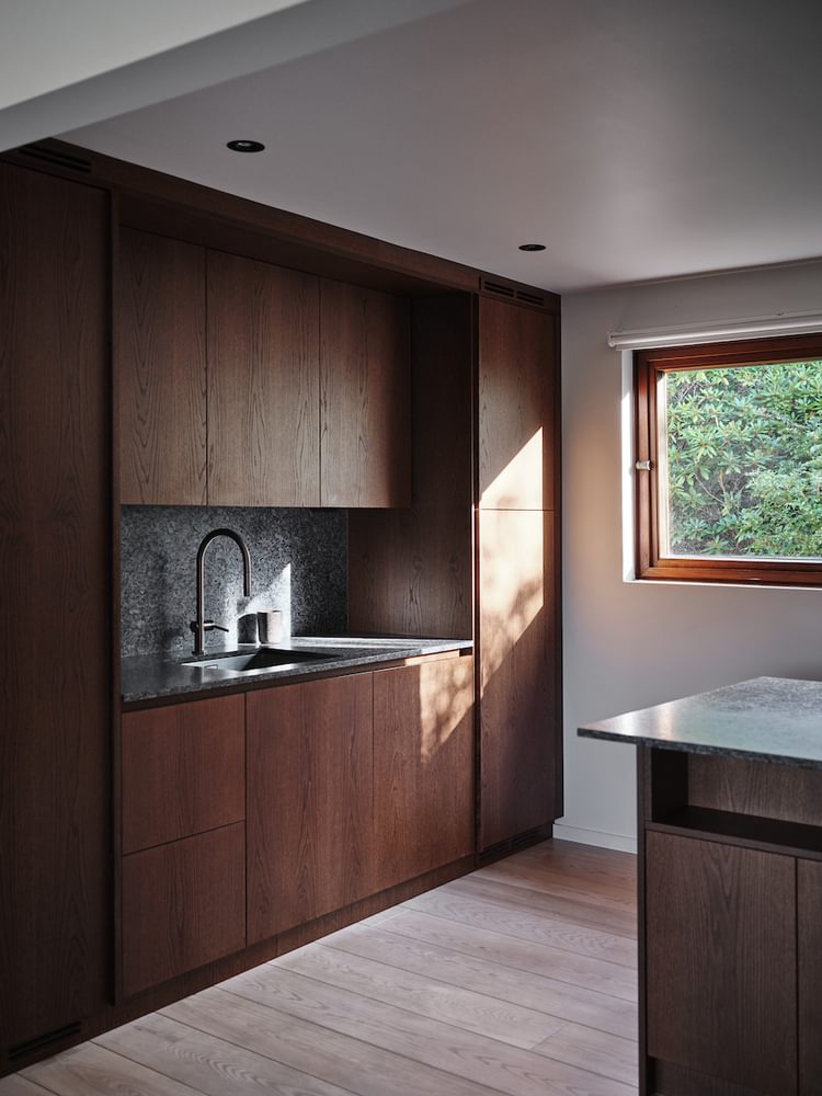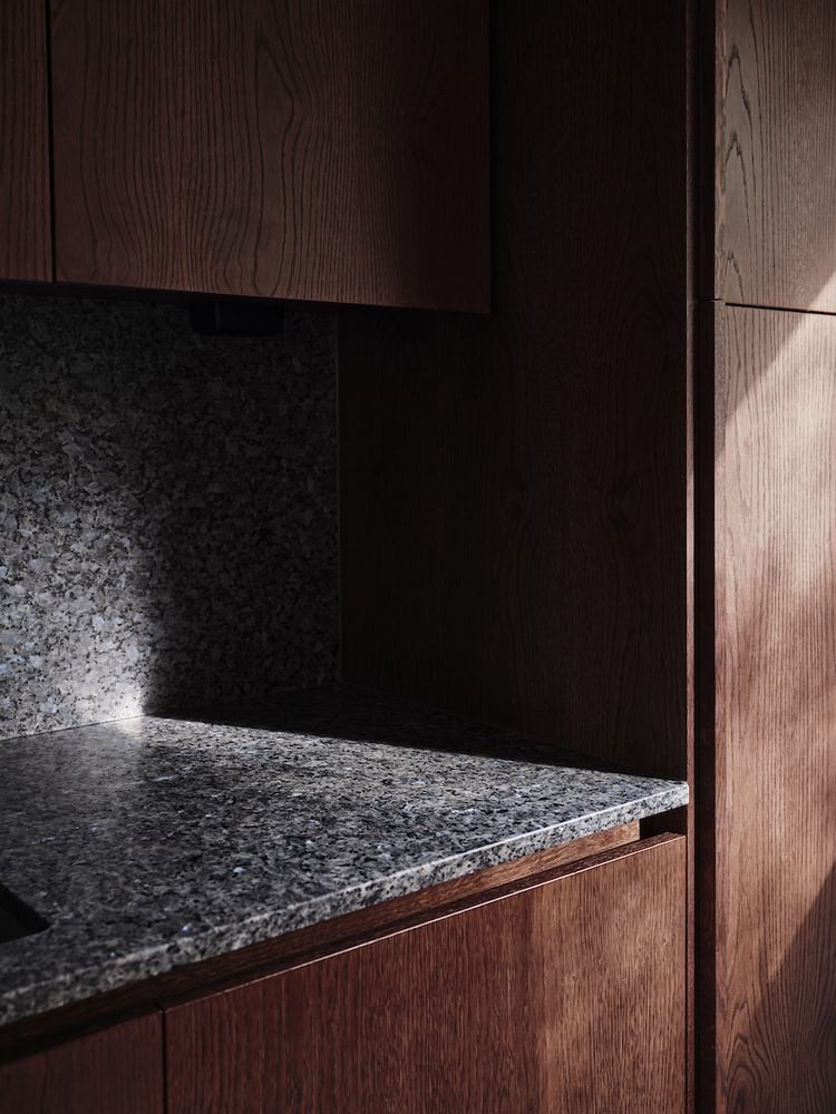 The natural veining and knotting of the wood are a beautiful complement to the naturally varied tones of the stone. The lightest colour in Lundhs’ portfolio, the exquisite grey and ice-blue crystals of Lundhs Royal juxtapose with the warmth of the wood, while adding depth and interest to the space. The surface’s silk finish offers a structured, matt aesthetic adding to the contemporary feeling of the home, whilst still being smooth to touch.