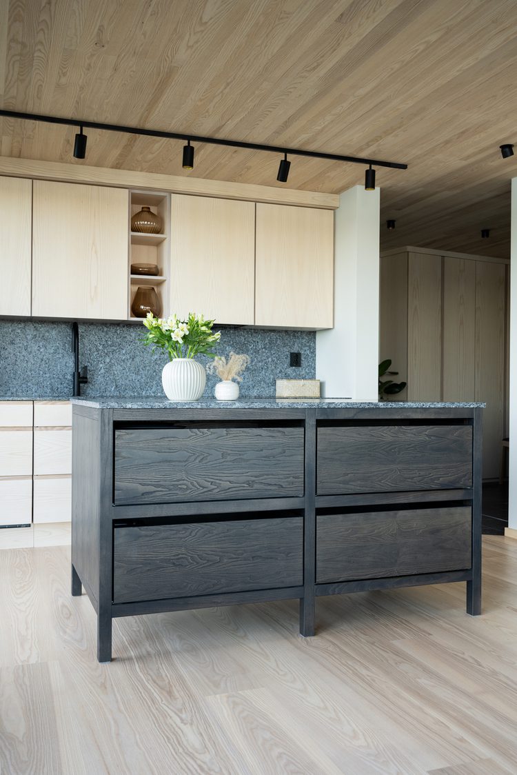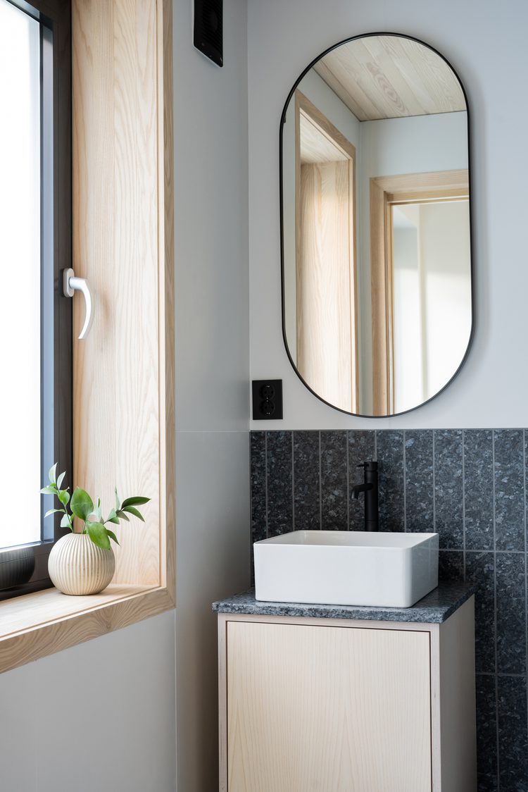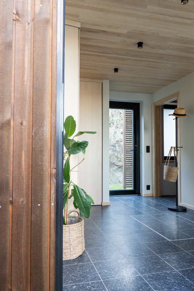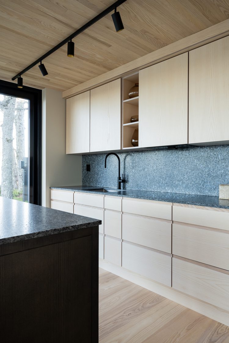 Inside, the interior continues the warmth and character of natural materials. Ash on the floors, ceilings, and walls adds a sense of coziness and stands in elegant contrast to the tactility of the larvikite, while black details in lighting, door handles, and fittings reflect the modern lines of the façade. Lundhs Blue® is also used as a recurring material indoors – as tiles in the bathroom and entrance, as well as in the open-plan kitchen and living area, where both the kitchen island and fireplace are clad in the same stone. The kitchen island serves as a unifying element that ties the space together. The result is a seamless continuity that elegantly connects interior and architecture.