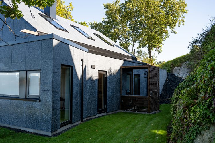 It is clad in Lundhs Blue®, a blue larvikite sourced directly from Lundhs’ own quarries, covering both façade and roof. The result is a cohesive and timeless expression, where the stone’s distinctive blue-grey color variations and natural texture provide both strength and character. The stone-clad roof further emphasizes the building’s robust yet elegant architecture and creates a natural connection with the surrounding landscape.