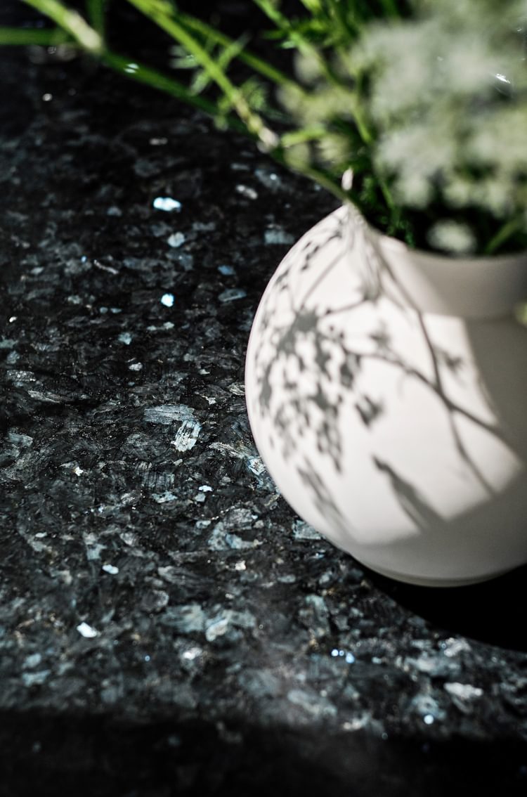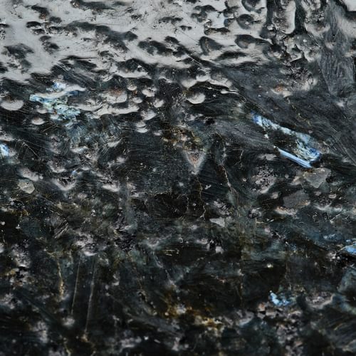 Dark features a deep black background with numerous blue crystals and is stocked by distributors of slabs and tiles.